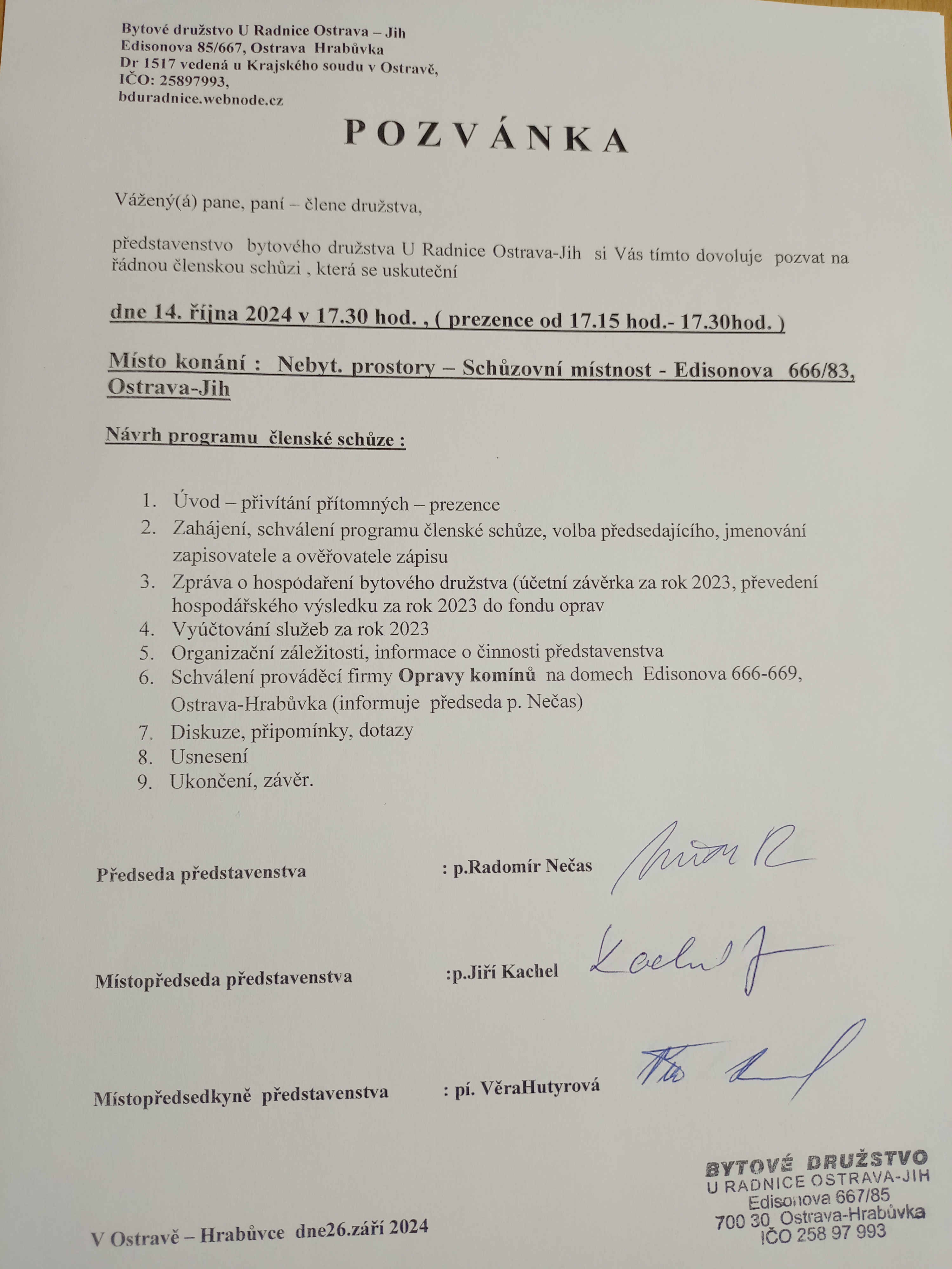 - Schválení úprav STANOV družstva (účast notáře (Valigurová –Mihálik – společná notářská kancelář, 28.října 1610/95, Ostrava-Moravská Ostrava)